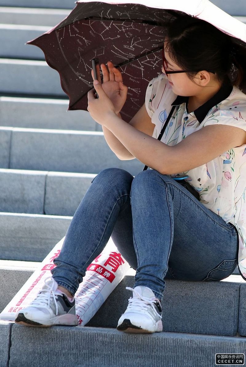 公園臺階抓拍的牛仔褲美女
