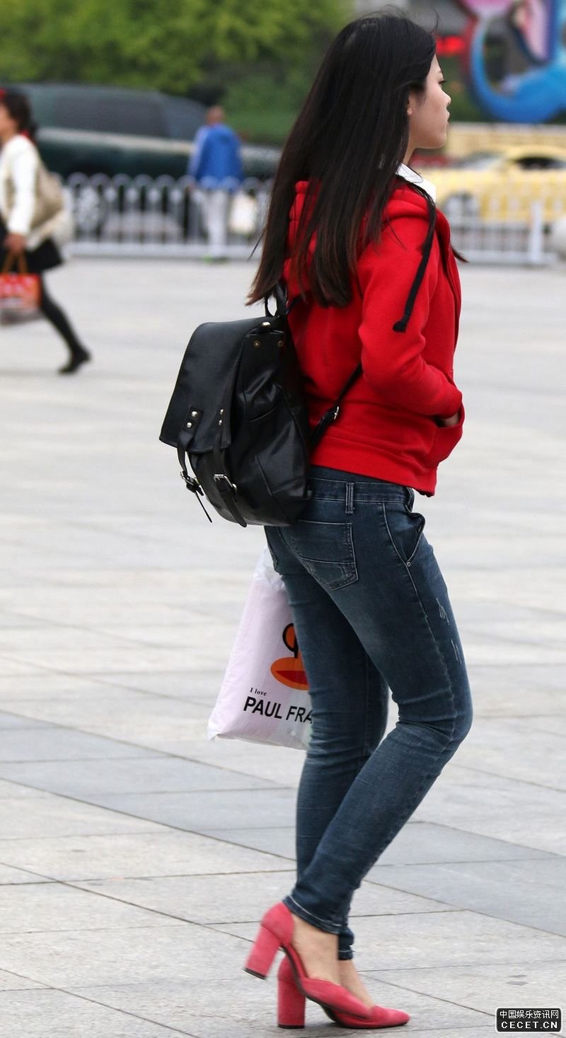 上美廣場(chǎng)街拍的紅衣牛仔褲美女