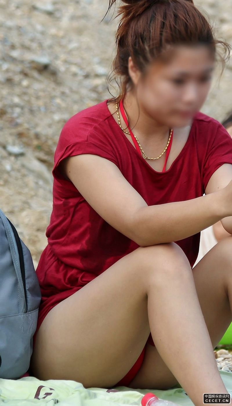 海邊抓拍豐滿(mǎn)的紅色泳裝美女
