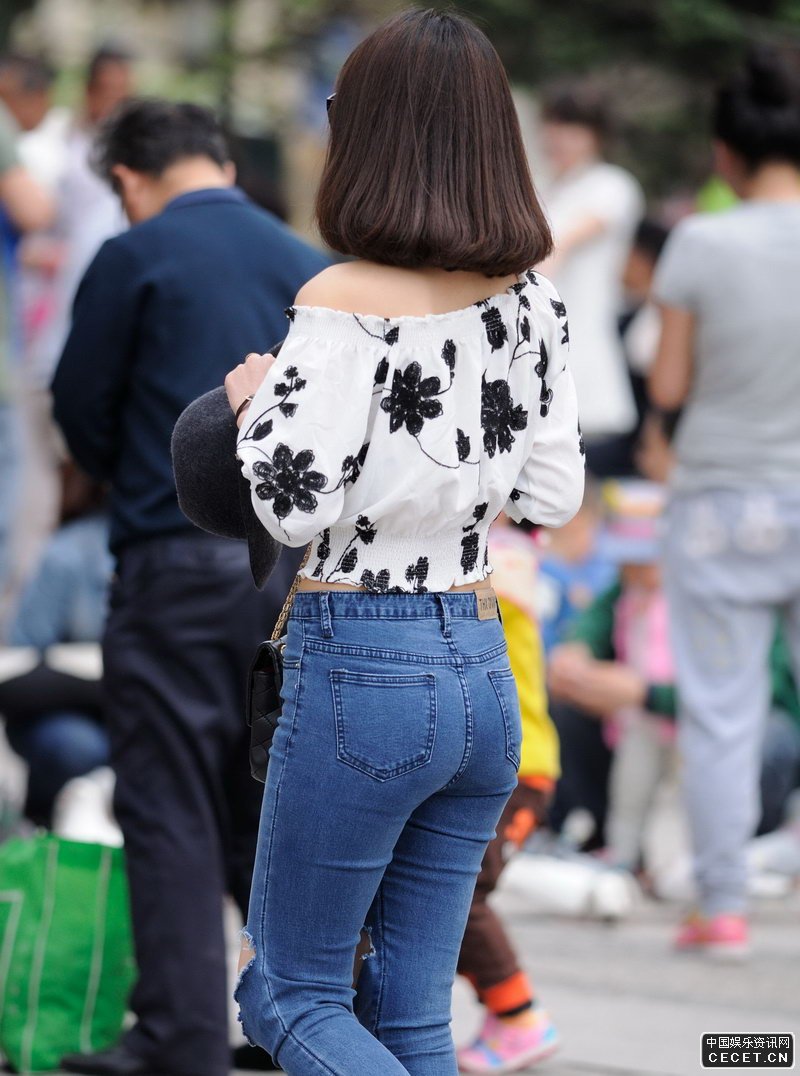 廣場(chǎng)街拍的破洞牛仔褲美女