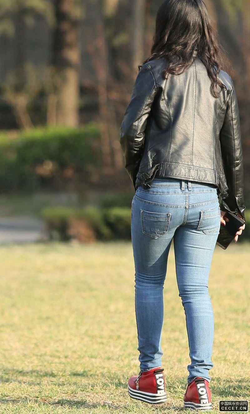 公園草坪抓拍的牛仔緊身褲美女