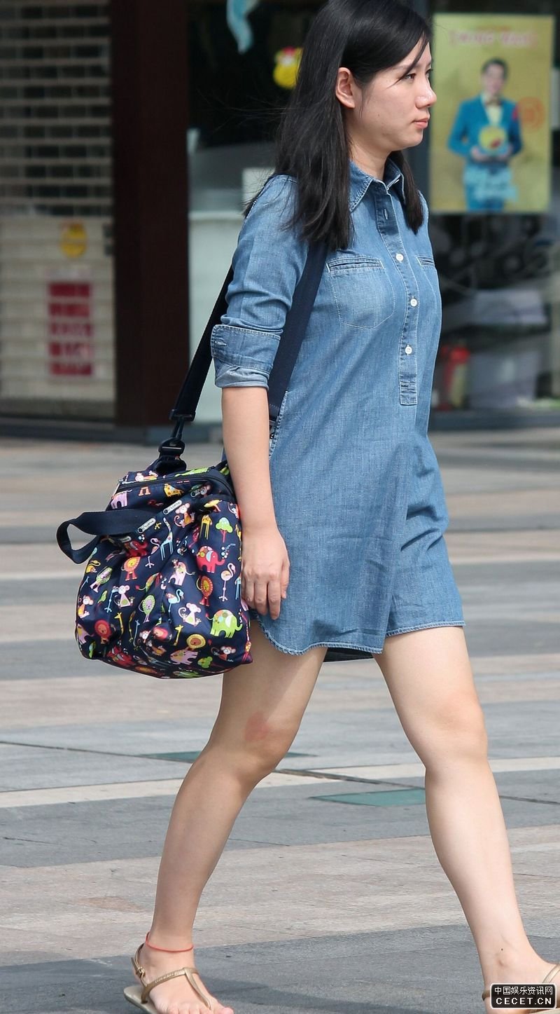 街拍的牛仔長(cháng)衫白嫩裸腿美女