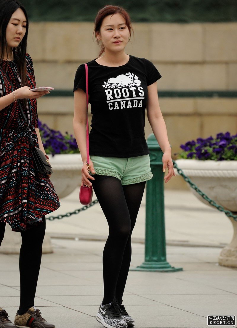 廣場(chǎng)街拍的綠色短褲黑絲襪美女