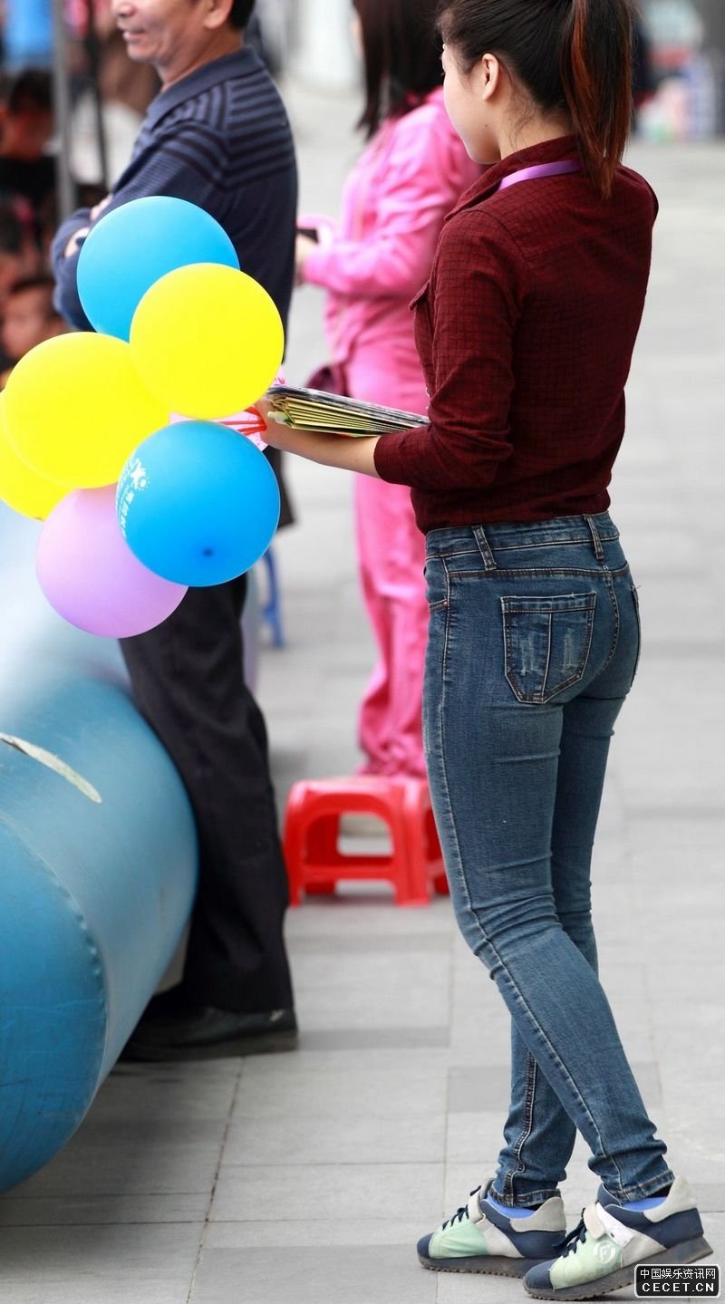 街拍發(fā)傳單的緊身牛仔褲美女