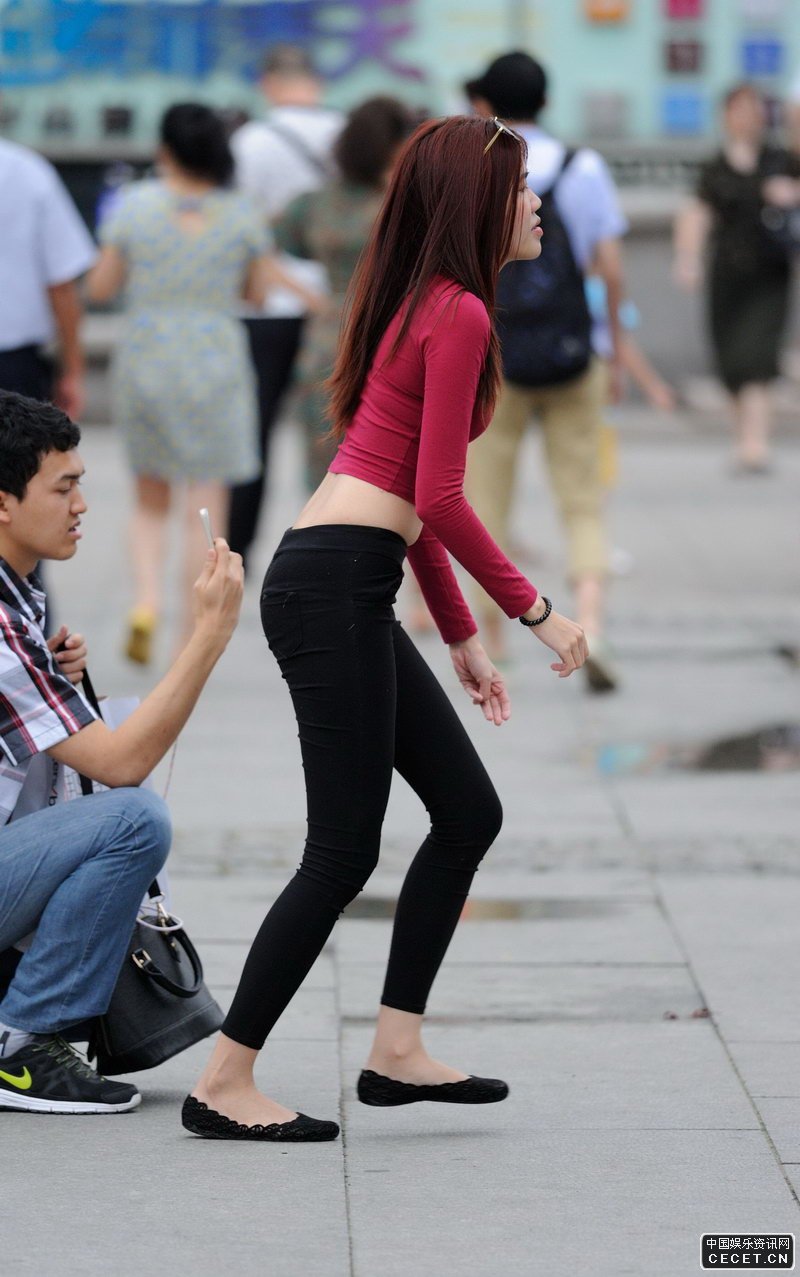 廣場(chǎng)街拍的黑色緊身褲露臍美女