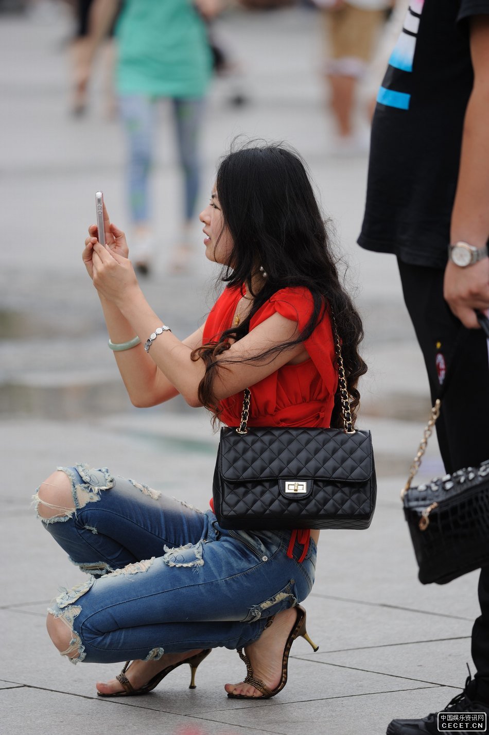 噴泉廣場(chǎng)街拍的破洞牛仔褲美女