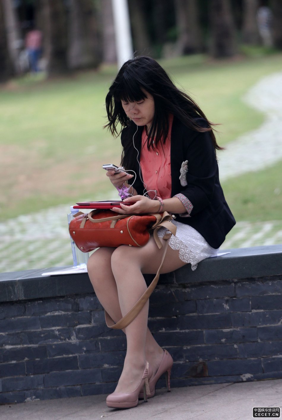 公園抓拍文靜的白色薄絲女孩