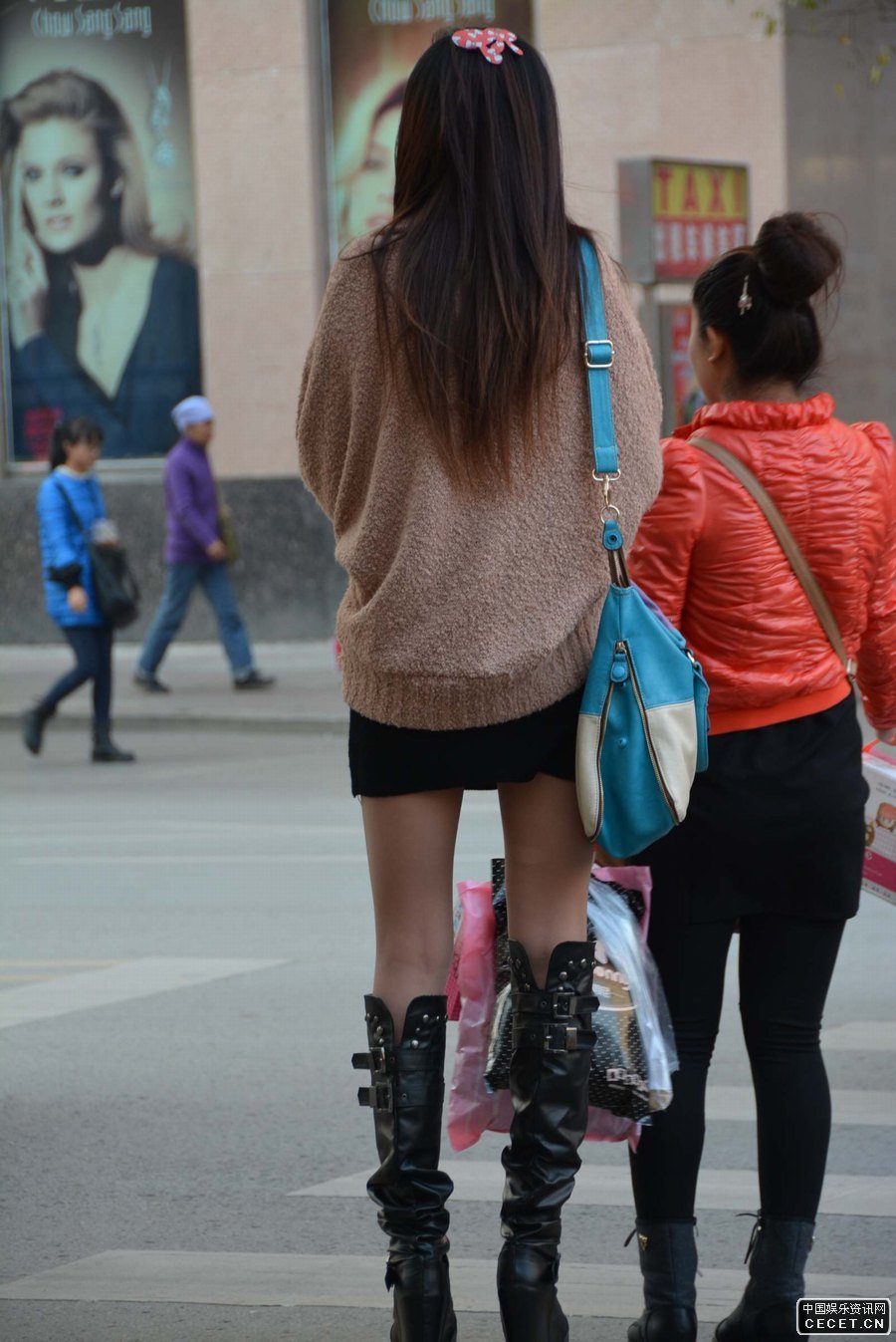 街拍的黑色長(cháng)筒靴苗條好身材妹子
