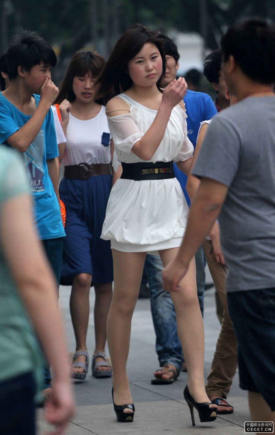 街拍的白色露肩短裙肉絲襪女孩