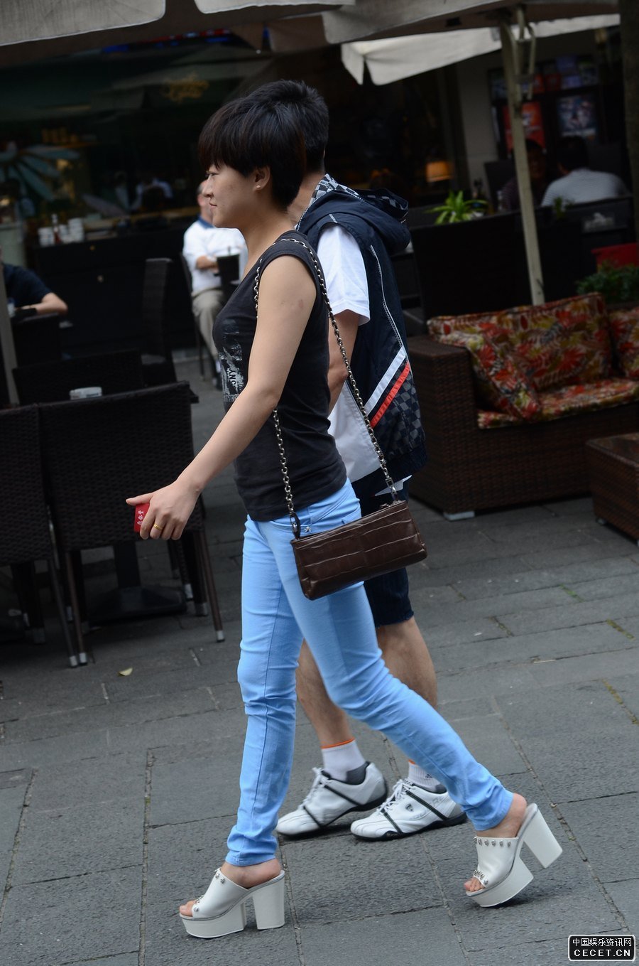 短發(fā)美女緊身牛仔褲清爽的感覺(jué)