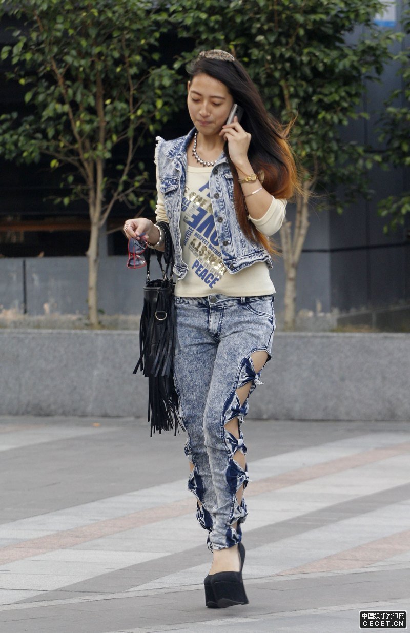 穿孔牛仔褲美眉前衛的裝束酷炫拉風(fēng)