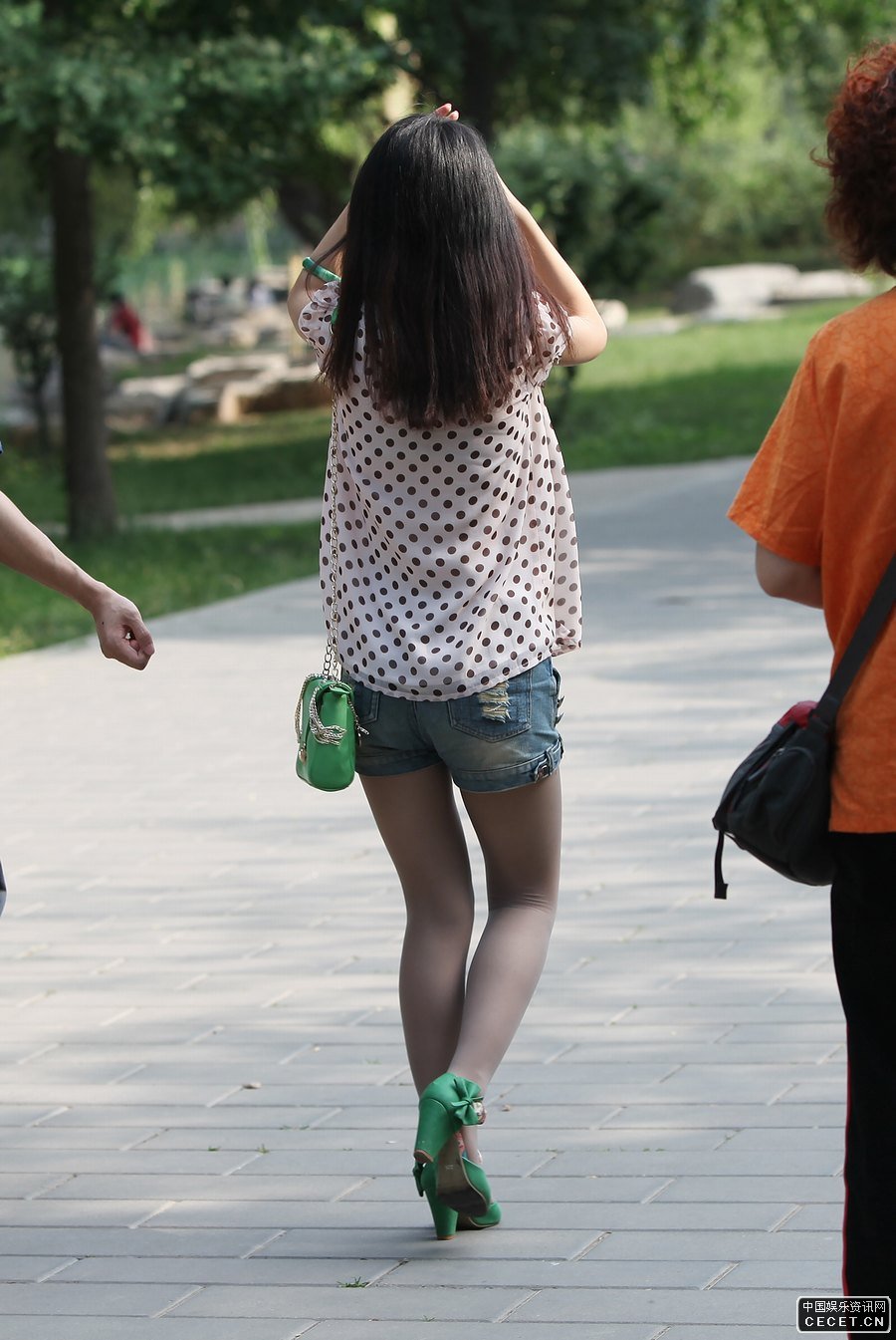 公園抓拍的牛仔短褲灰絲美女