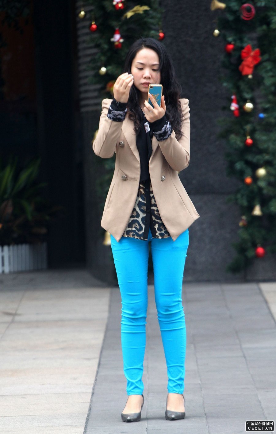 街拍綠色鉛筆褲靚麗美女亭亭玉立