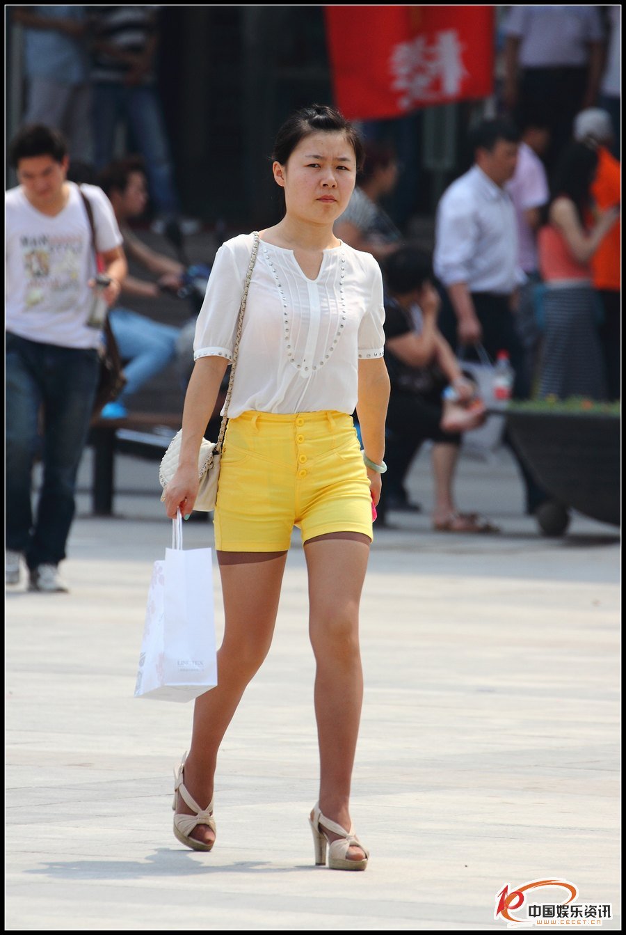 街拍黃色高腰熱褲咖啡色絲襪美女
