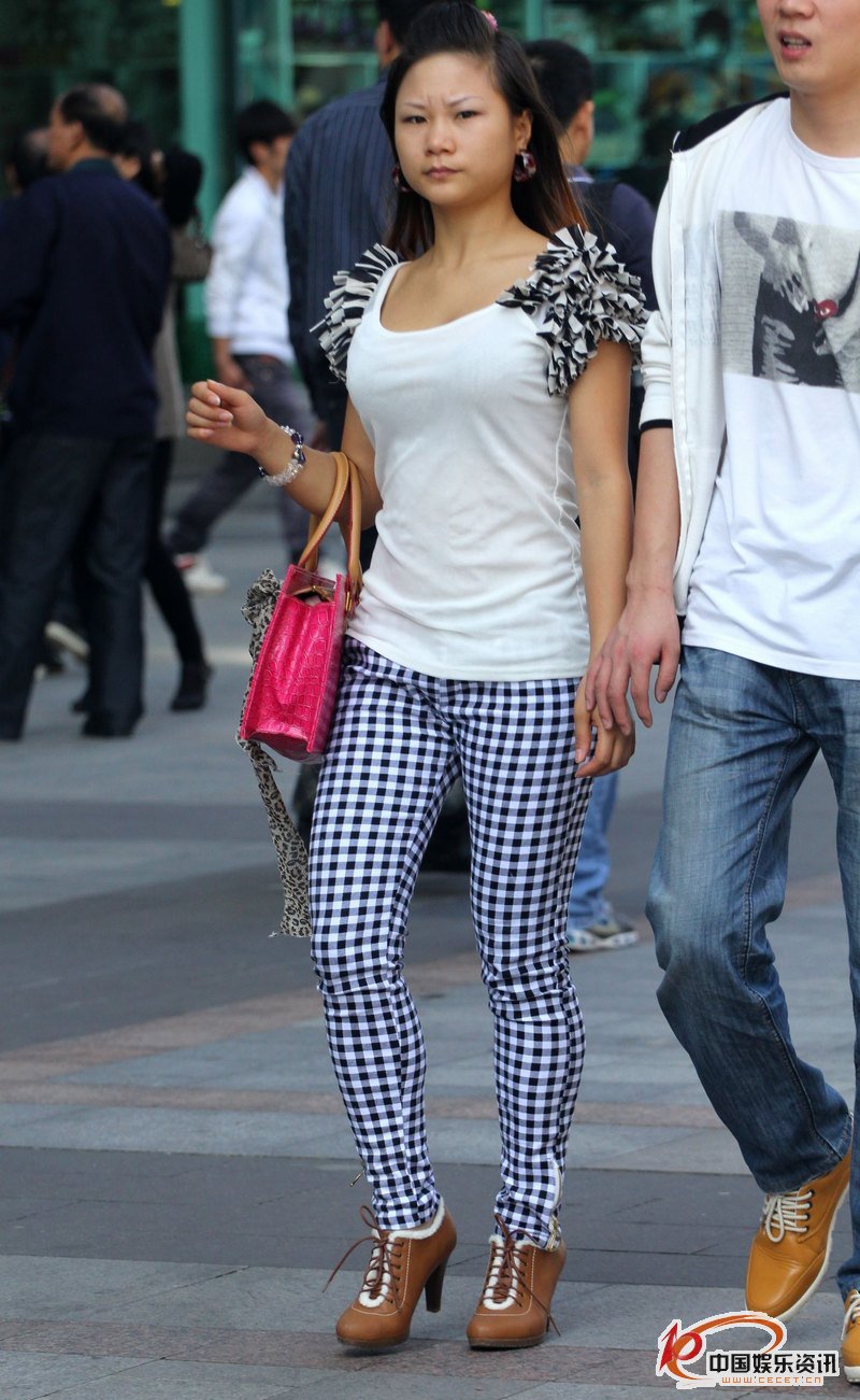 大學(xué)東路街拍的花格子長(cháng)褲美女