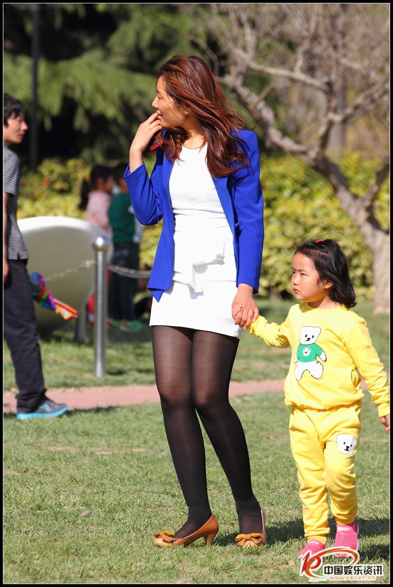 藍色外套白色連衣裙黑絲美腿辣媽
