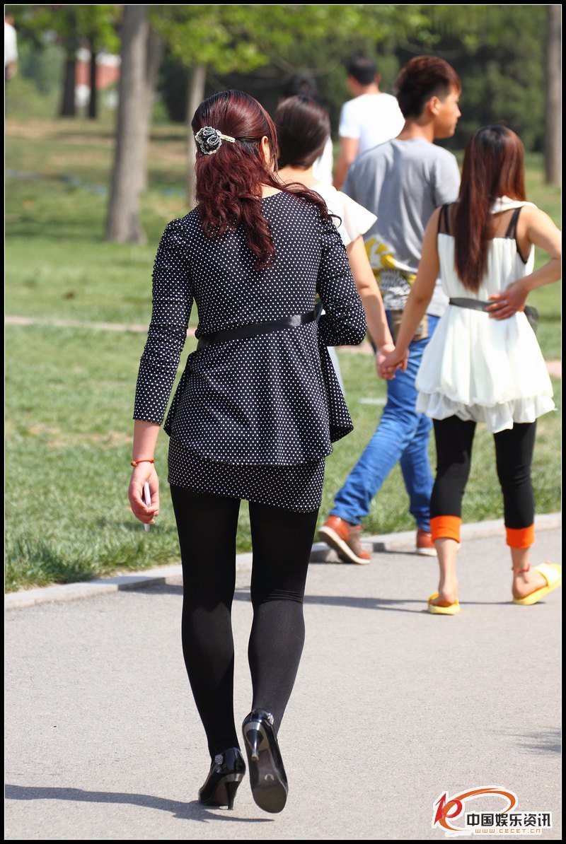 植物園抓拍的白點(diǎn)短裙套裝黑絲美女