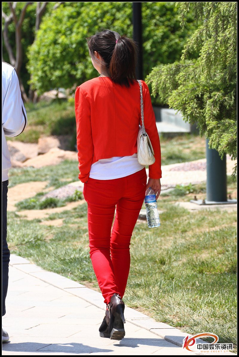 抓拍的紅色套裝修身長(cháng)褲時(shí)尚辣媽