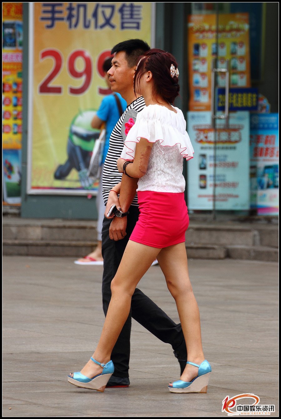 街拍的紅色短裙裸腿坡高跟美女