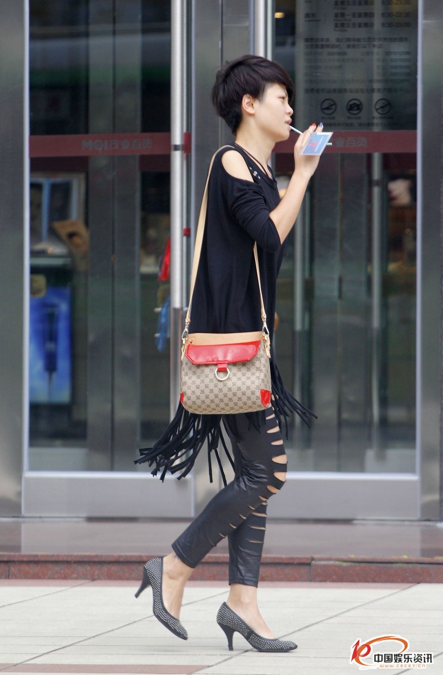 街拍的緊身皮褲個(gè)性短發(fā)妹子