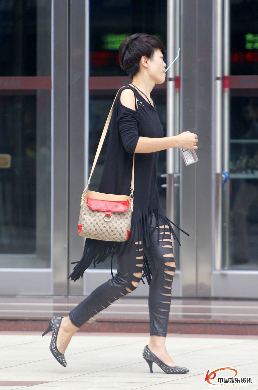 街拍的緊身皮褲個(gè)性短發(fā)妹子