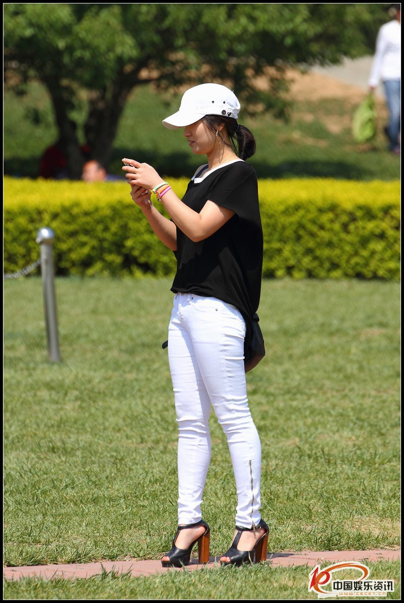 公園草坪抓拍的修身長(cháng)褲美女