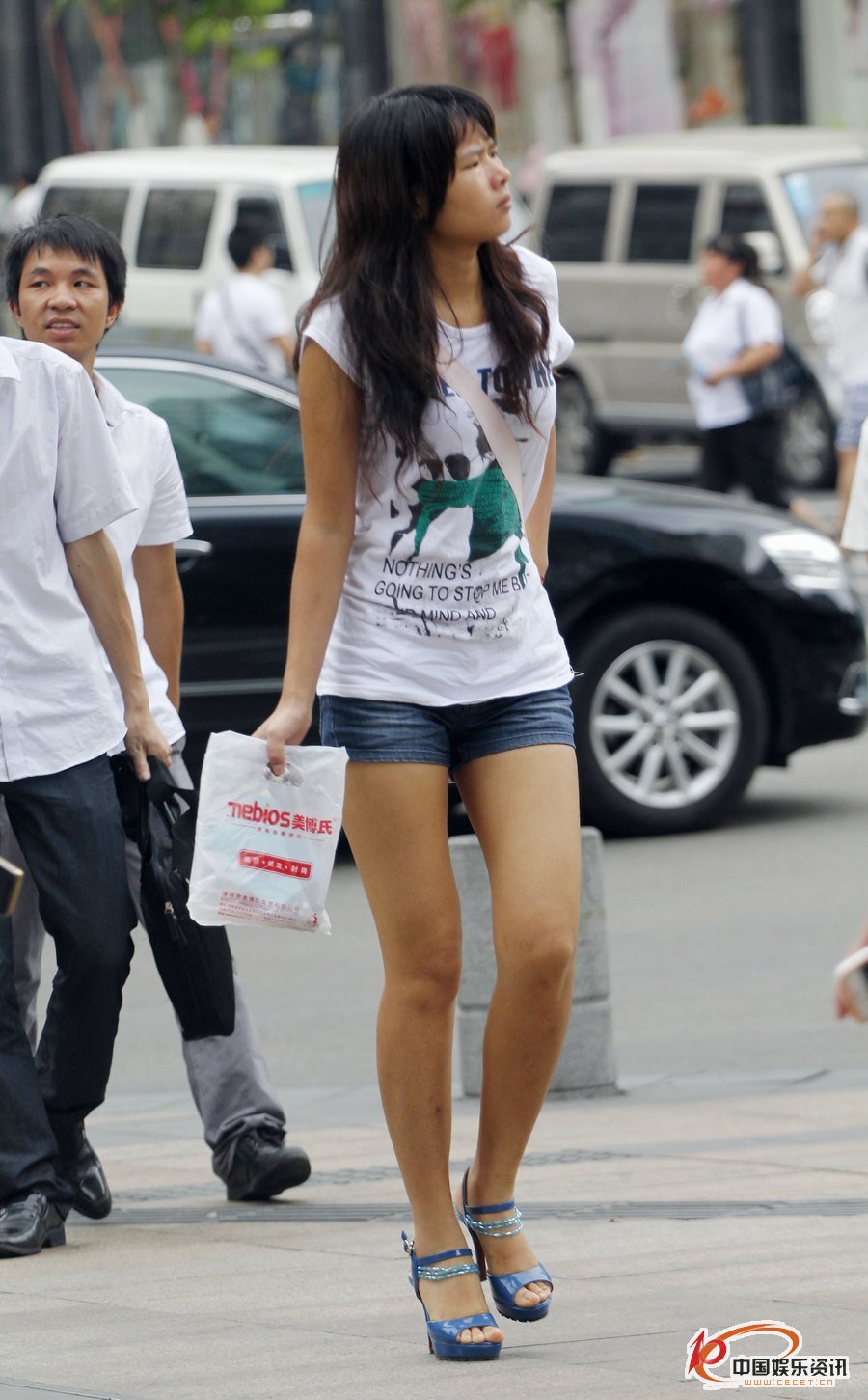 街拍的牛仔熱褲長(cháng)腿高挑妹子