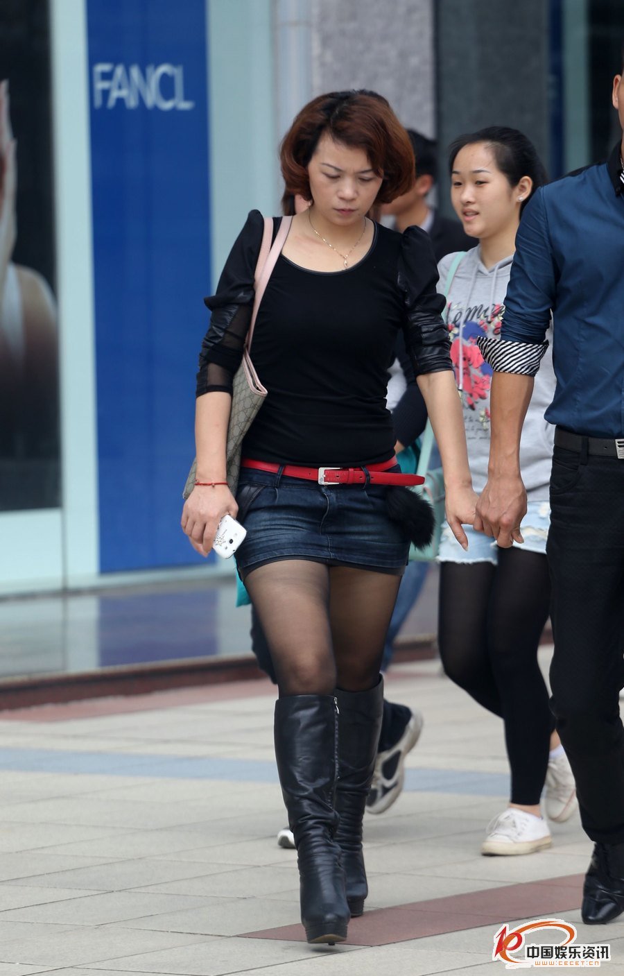 街拍牛仔短裙黑絲長(cháng)靴美少婦