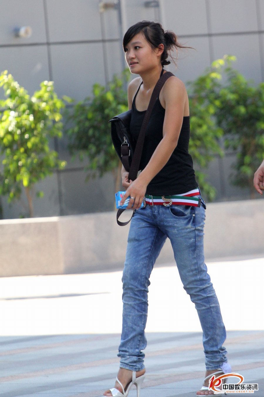 街拍的牛仔長(cháng)褲吊帶背心美女