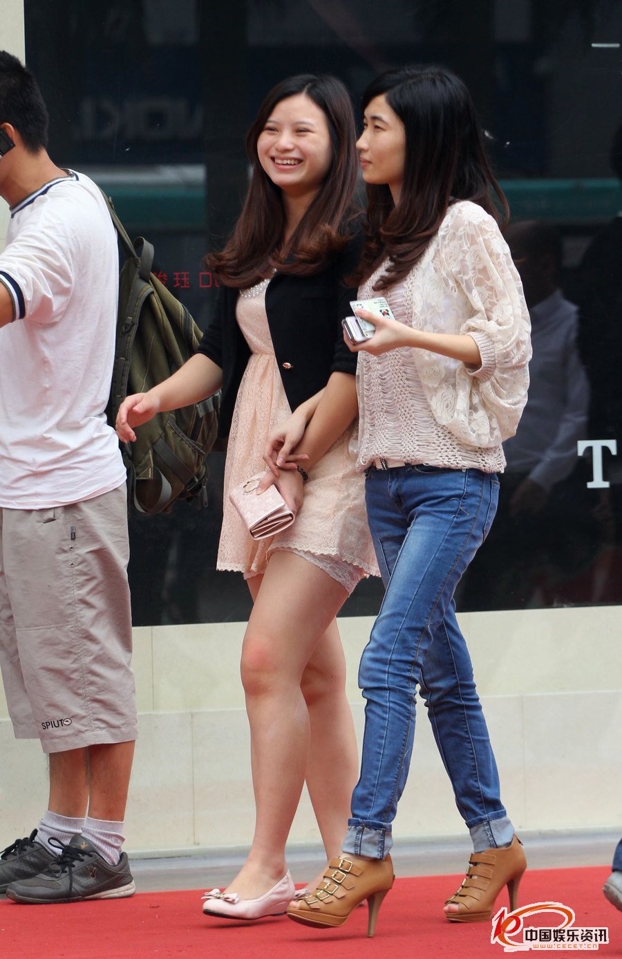 街拍的藍色牛仔褲針織薄衫美女