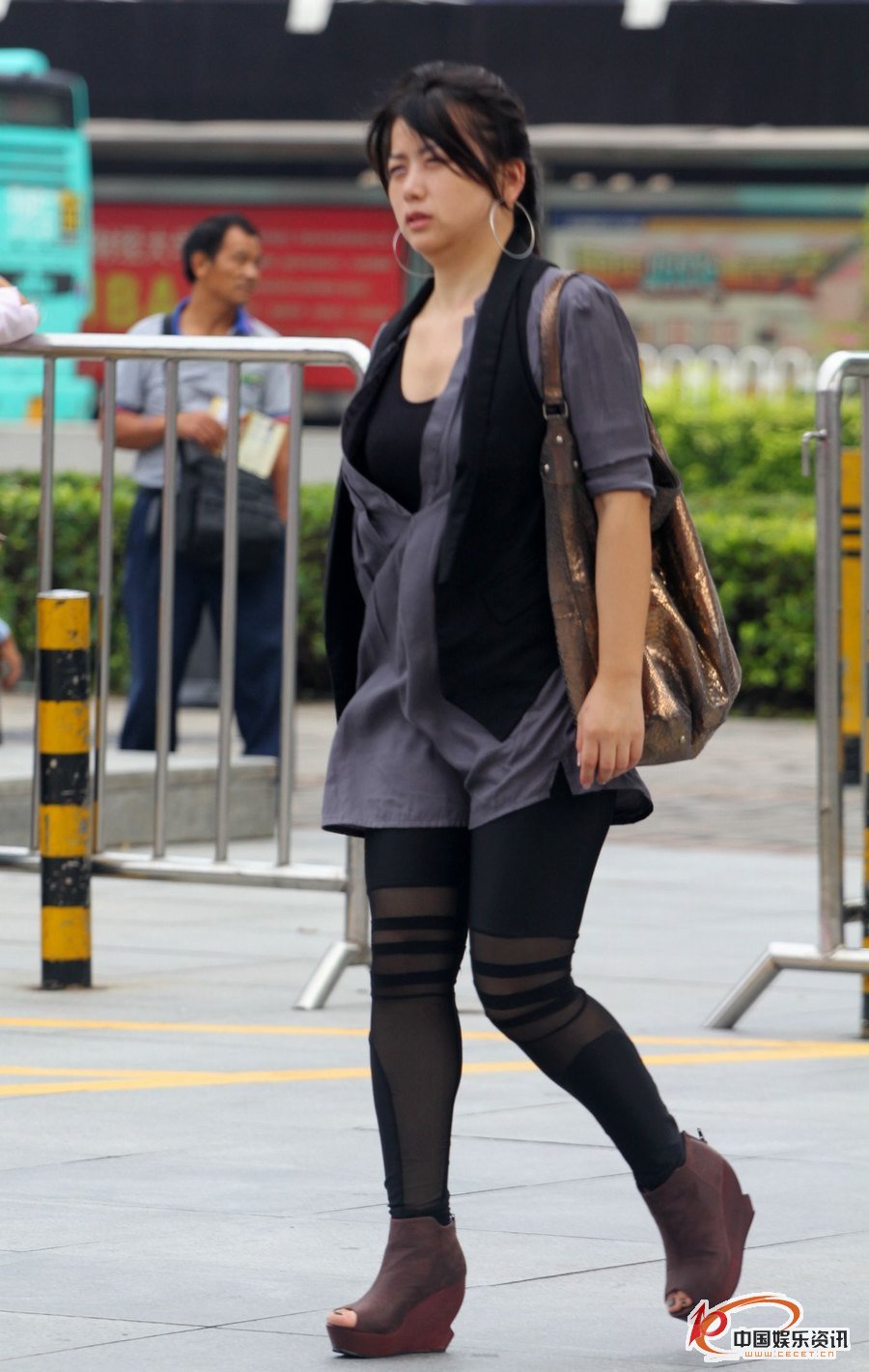 黑色個(gè)性打底褲美女體態(tài)豐滿(mǎn)