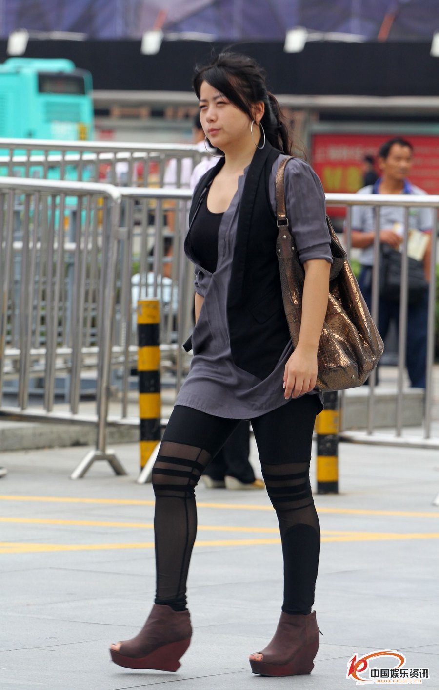黑色個(gè)性打底褲美女體態(tài)豐滿(mǎn)