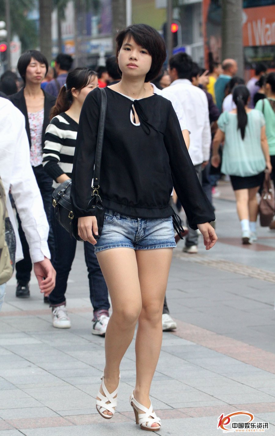熱褲短發(fā)妹子面容清秀雪白的雙腿