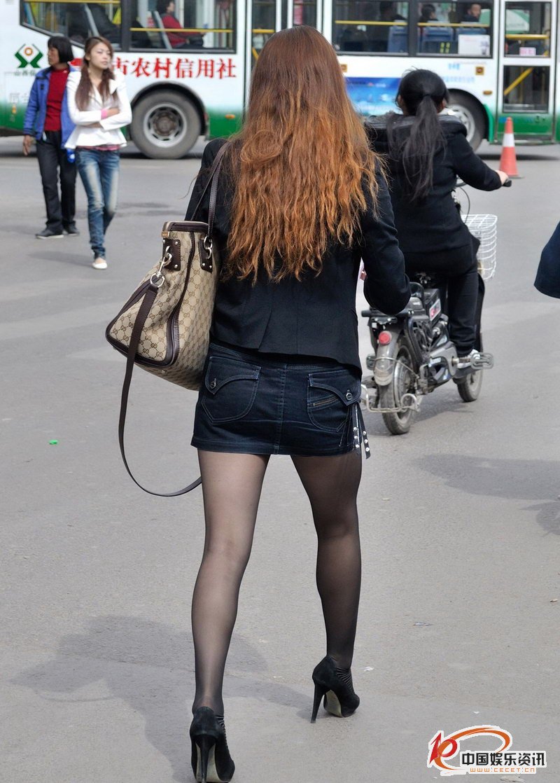 街拍的牛仔裙黑絲襪黃披發(fā)美女