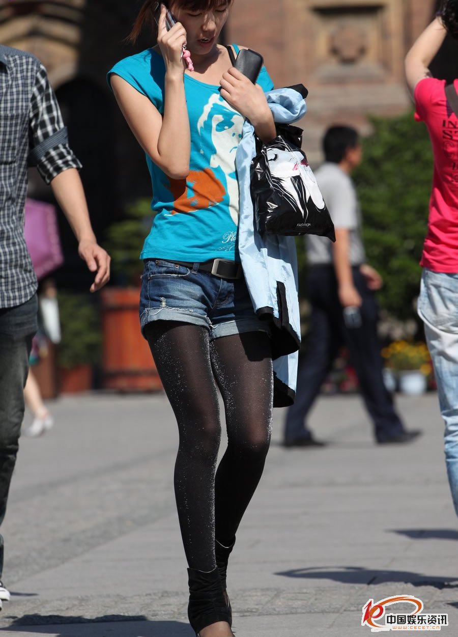 街拍的閃亮黑絲襪馬尾辮女孩