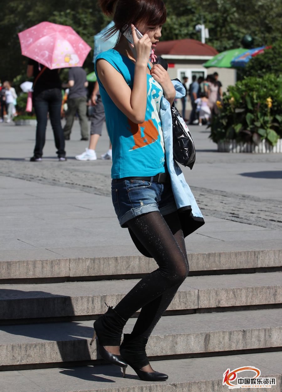 街拍的閃亮黑絲襪馬尾辮女孩