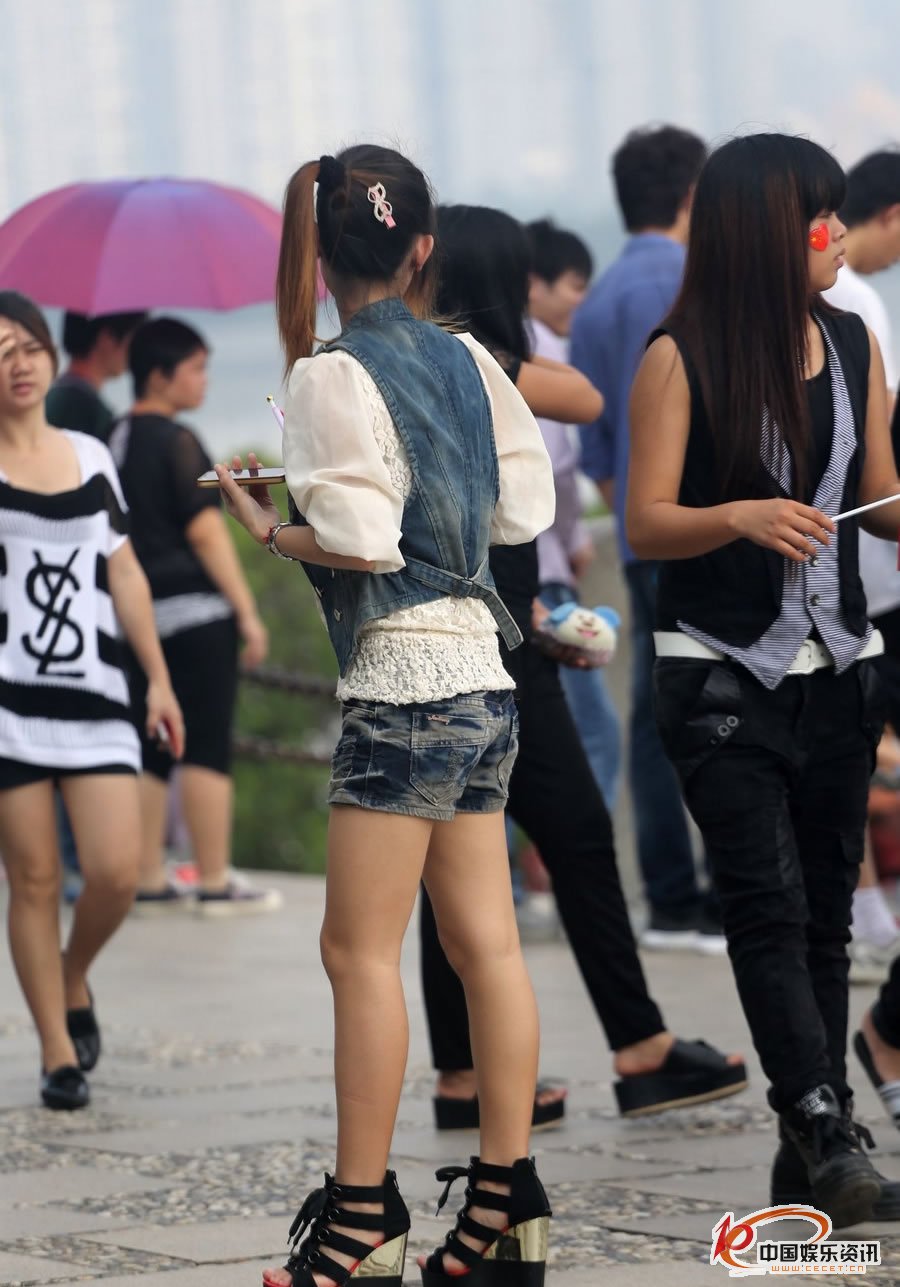 湖邊抓拍的牛仔短褲裙妹妹