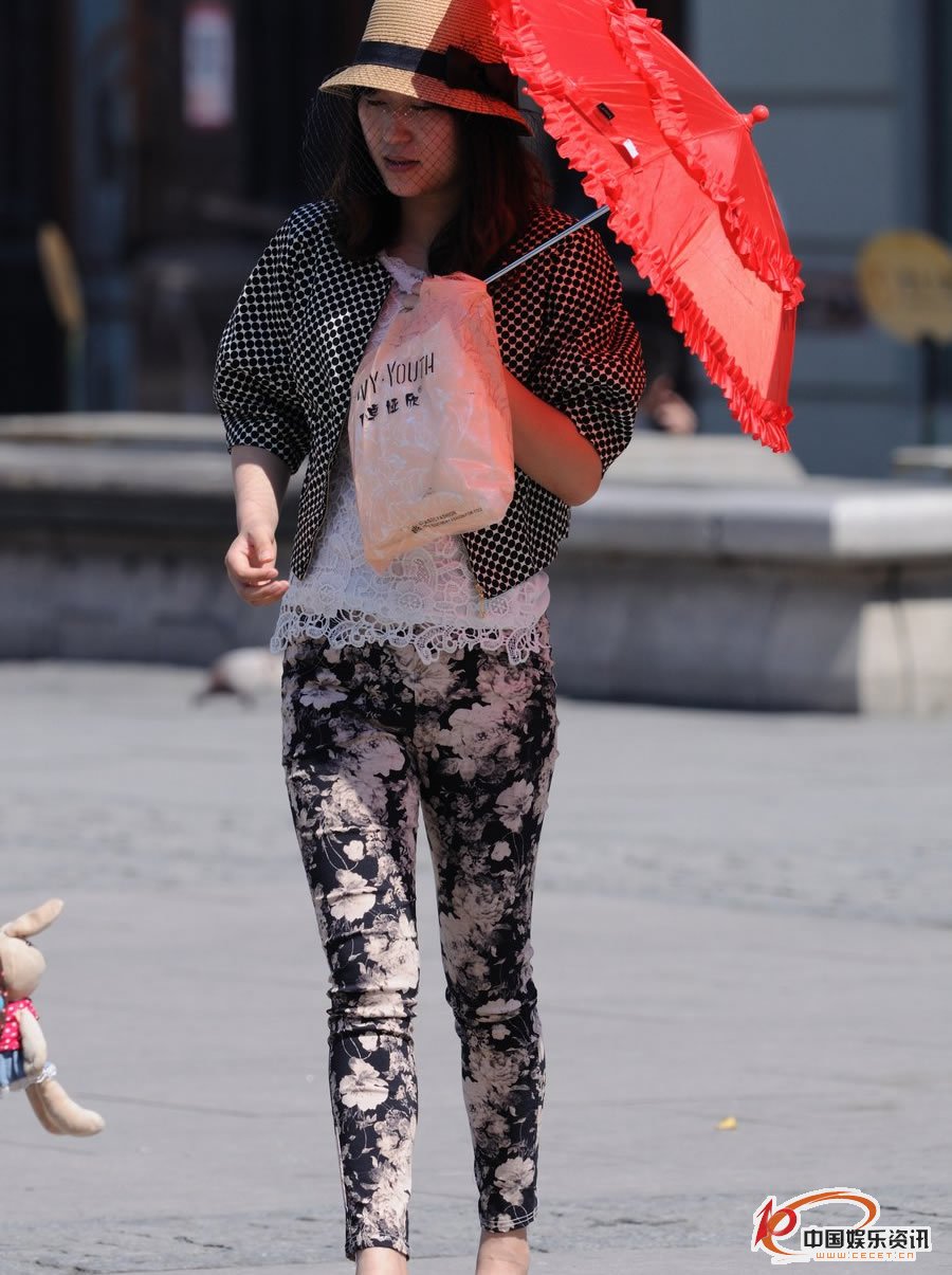 廣場(chǎng)街拍的草帽花褲年輕媽媽