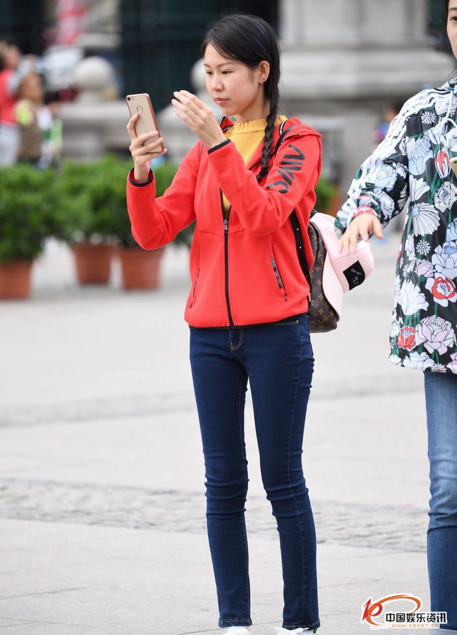 街拍的紅衛衣牛仔褲長(cháng)辮美女