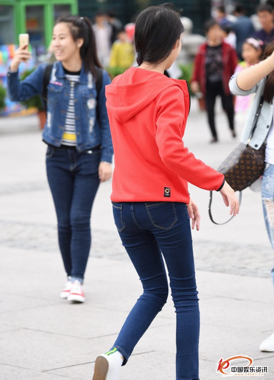 街拍的紅衛衣牛仔褲長(cháng)辮美女