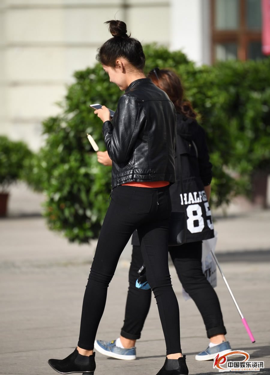 街拍的緊身黑褲丸子頭美眉