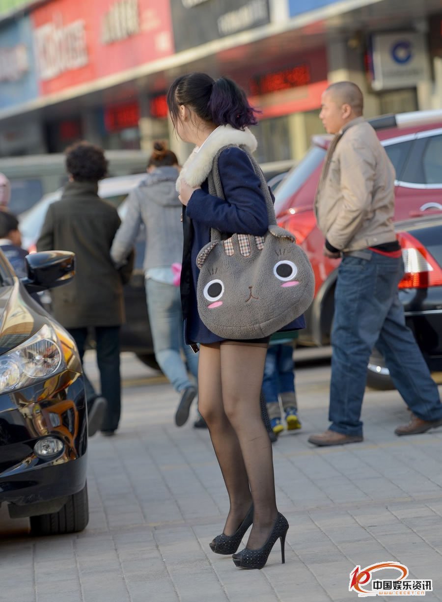 藍色毛領(lǐng)短大衣超薄黑絲妹子