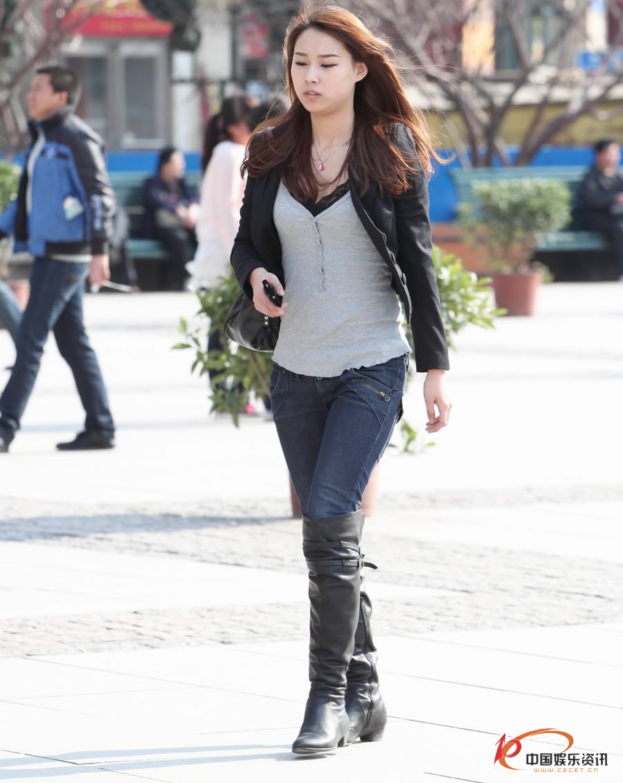 街拍的緊身牛仔褲長(cháng)靴美女