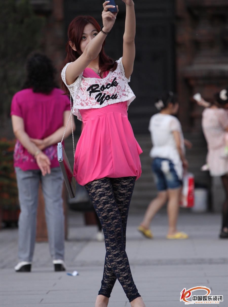 街拍粉色連衣裙黑蕾絲褲襪美女