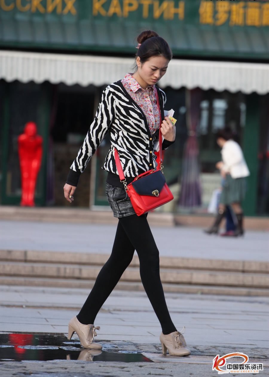 街拍的黑色打底褲樂(lè )觀(guān)大方美女