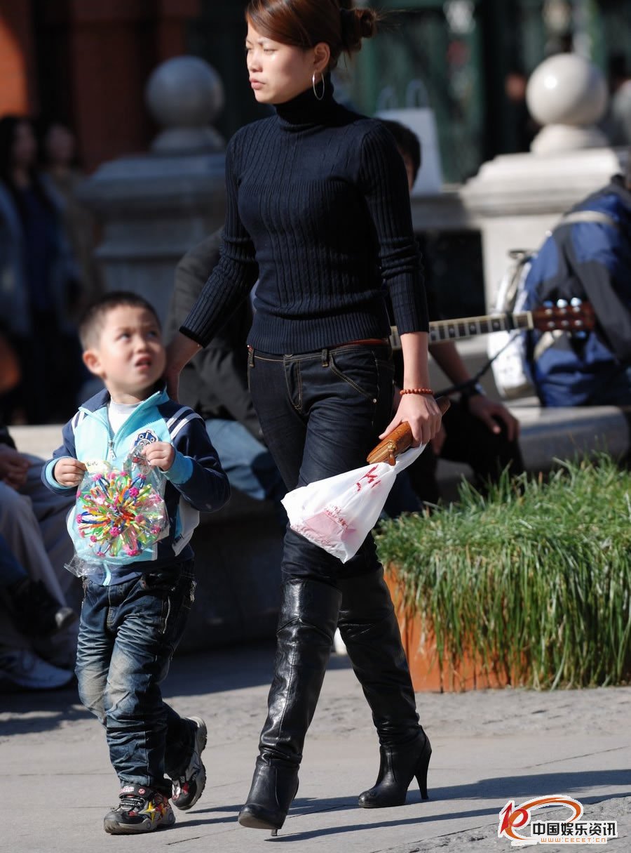 街拍的牛仔褲長(cháng)筒靴美少婦