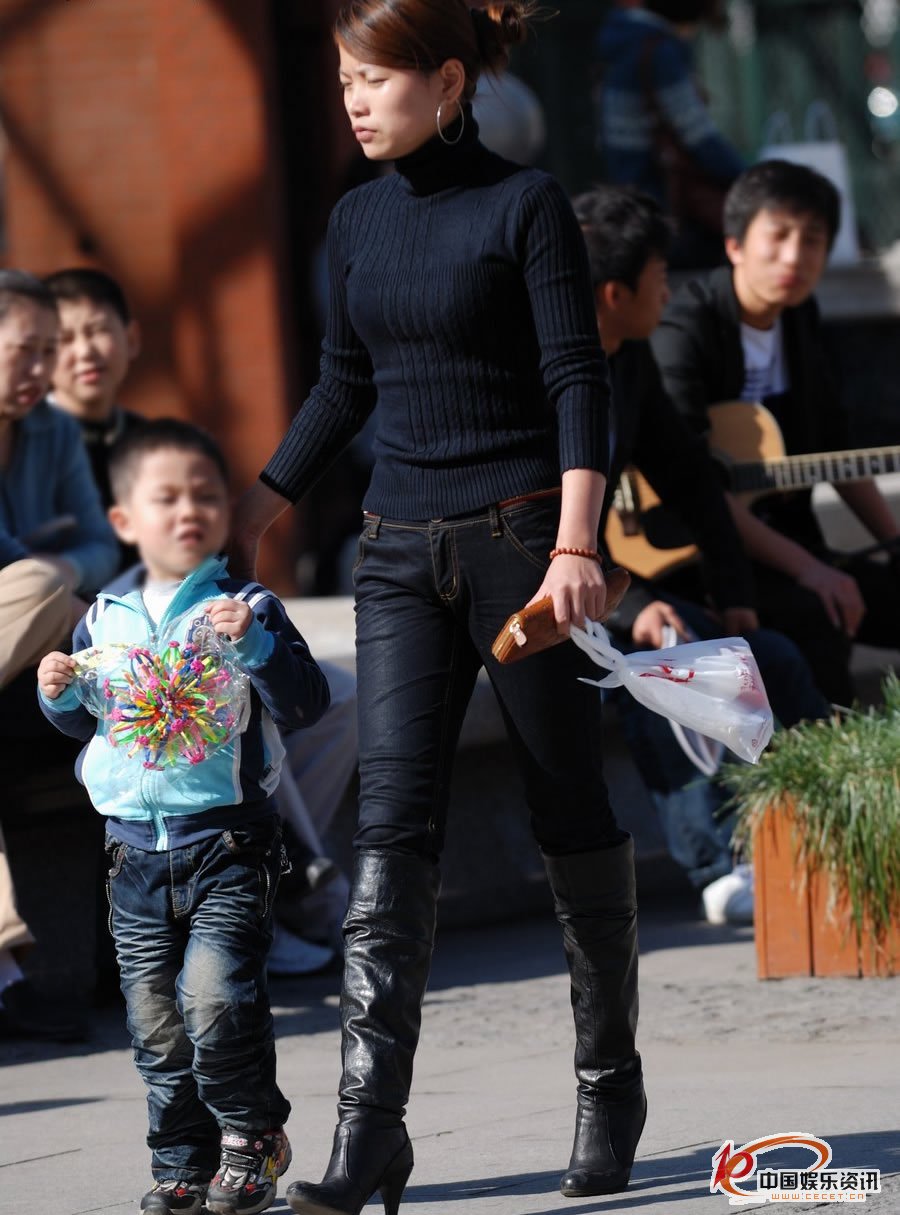 街拍的牛仔褲長(cháng)筒靴美少婦