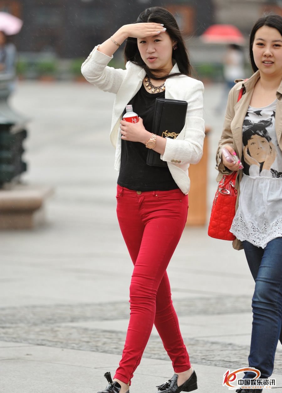 人民路街拍的紅色緊身褲美女