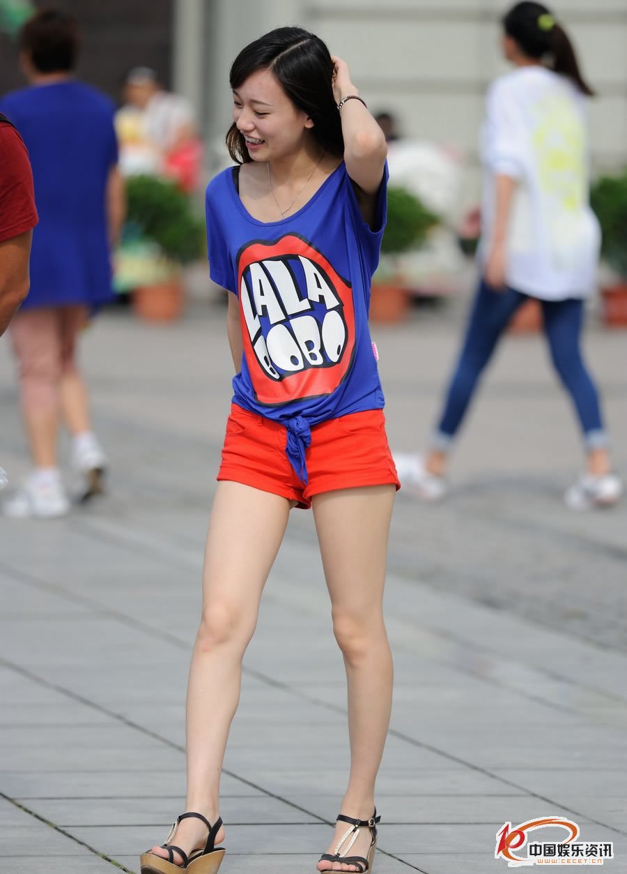 街拍的藍衫紅短褲開(kāi)心美女