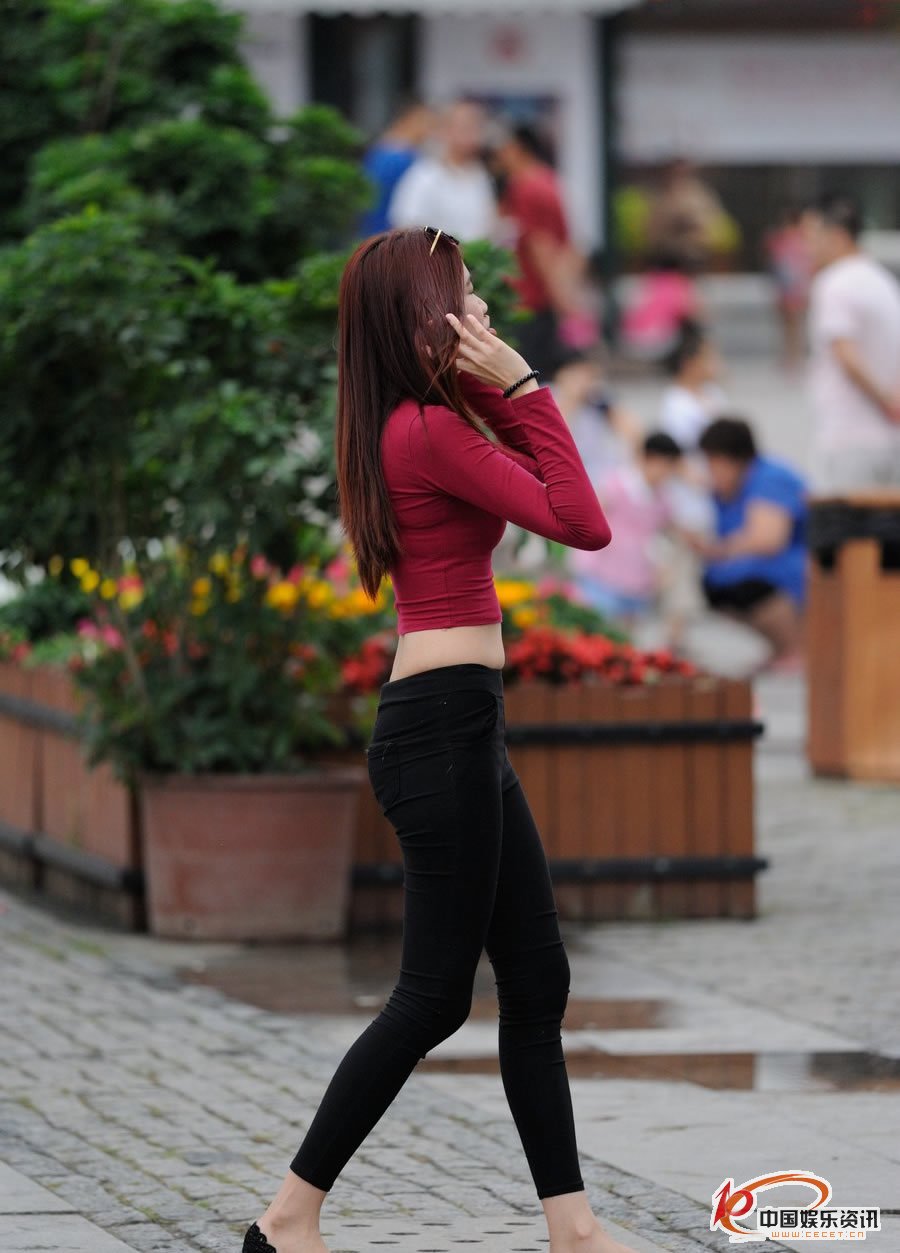 街拍的緊身黑褲露臍裝美女